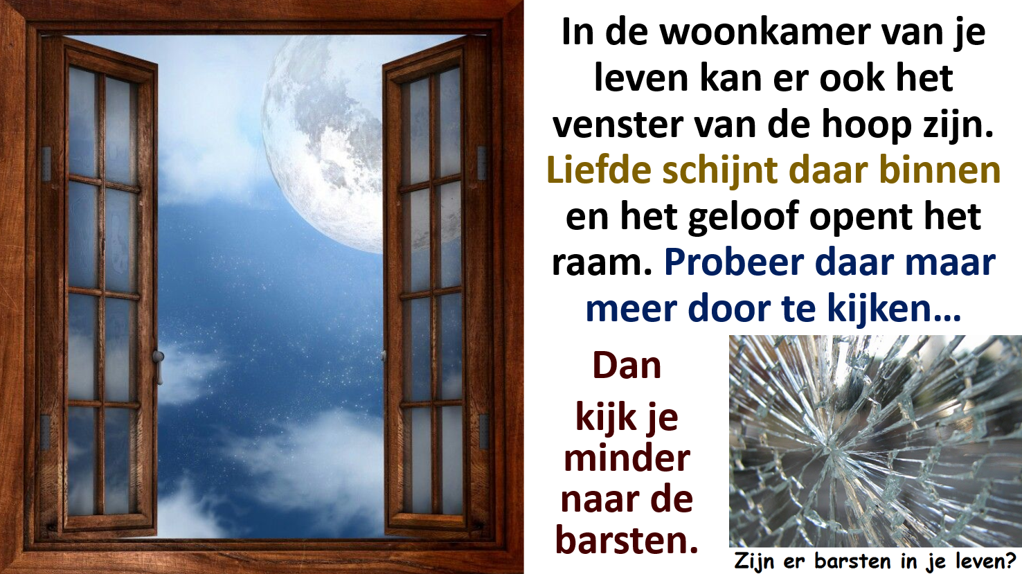 Laat de frisse lucht in je bedompte kamer binnenkomen. Als je meer door dit venster van de hoop leert kijken, ben je minder gefixeerd op de gebarsten ruit in je leven. Dat geeft steeds weer opnieuw lucht, hoop, geloof en liefde. Je heft dan je hoofd op uit de gebreken. Je krijgt dan weer uitzicht op een open hemel.