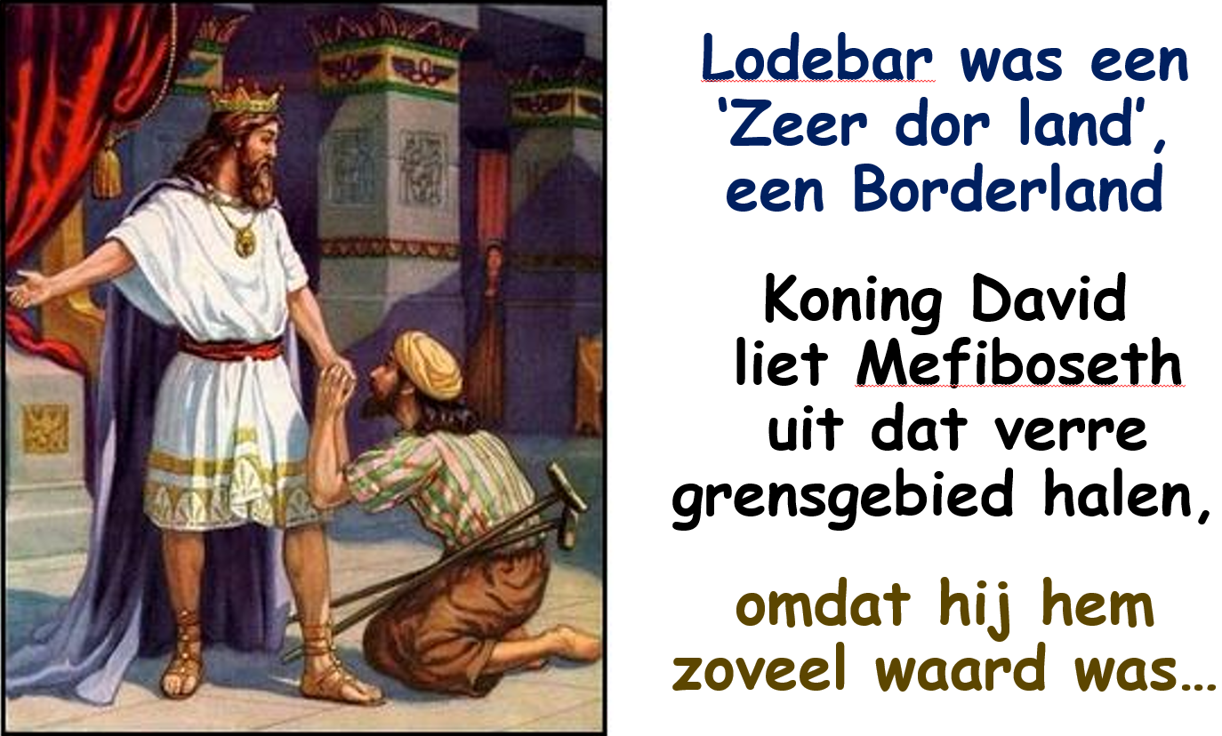 We komen het tegen in de geschiedenis van Mefiboseth, die als vijfjarige door zijn verzorgster werd opgepakt, maar zij heeft hem bij de haastige vlucht laten vallen. Hij raakte daardoor verlamd aan beide voeten (2 Sam 4:4). Wat een tragisch ongeluk in een panieksituatie! Vanaf dat moment hield de zoon van Jonathan zich min of meer schuil in het verre oord Lodebar (een zeer dor land). Het Hebreeuwse ‘Lo-dabar’ betekent: ‘niets’, en ‘Lo-Debar: ‘een ding van niets’.
