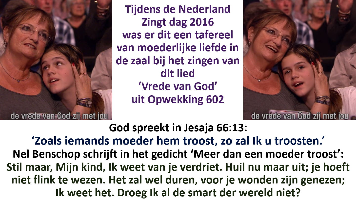 Hieronder volgt het lied Vrede van God uit Opwekking 602, gezongen Suzanne van der Velde tijdens de Nederland Zingt Dag van 2016: