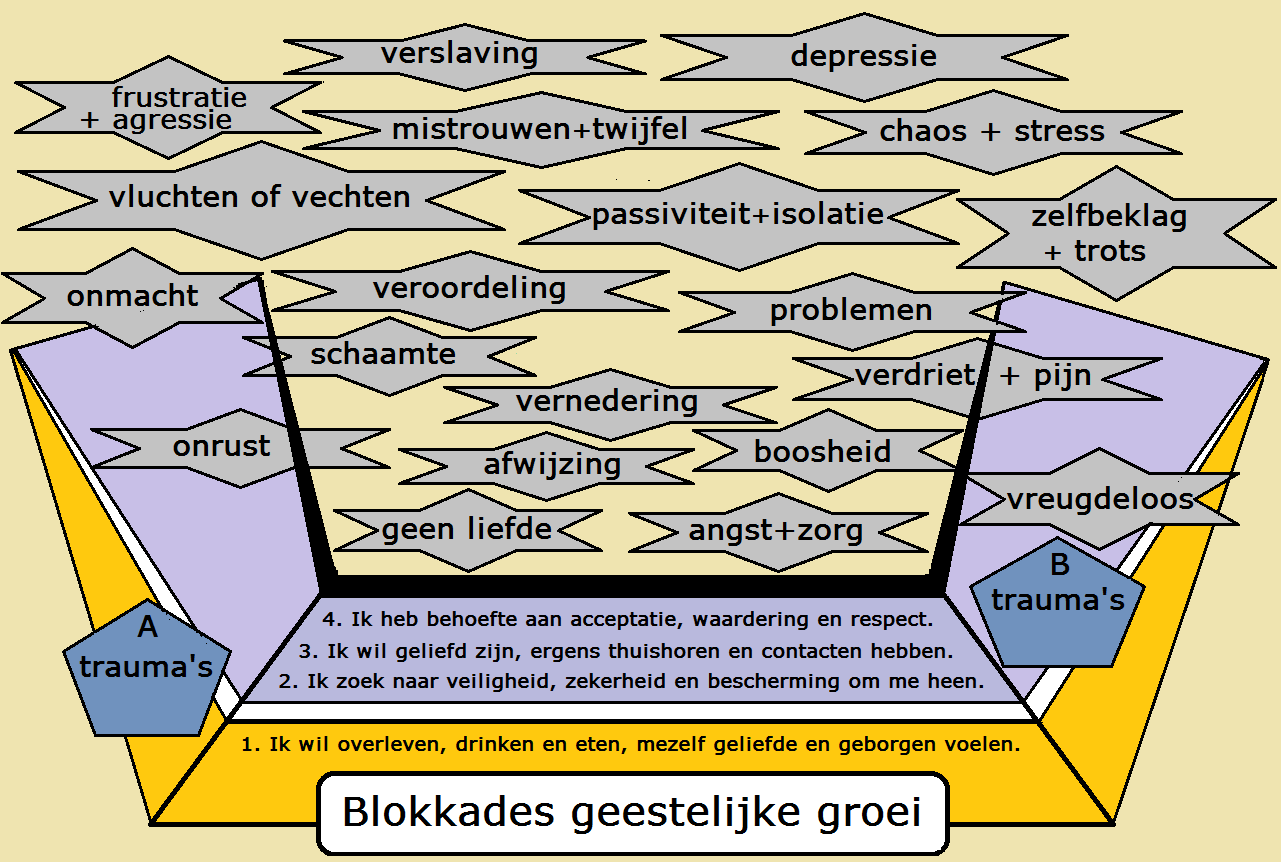 Op de afbeelding hieronder zie je welke zaken gezonde geestelijke groei kunnen blokkeren. Deze negatieve zaken, activiteiten en emoties worden overgedragen en opgelegd door opvoeders, relaties en de omgeving. Het zijn oorzaken en gevolgen van A-trauma’s en B-trauma’s, waaraan veel mensen levenslang lijden. Je ziet de mogelijke gevolgen van deze trauma’s op de afbeelding hieronder.
