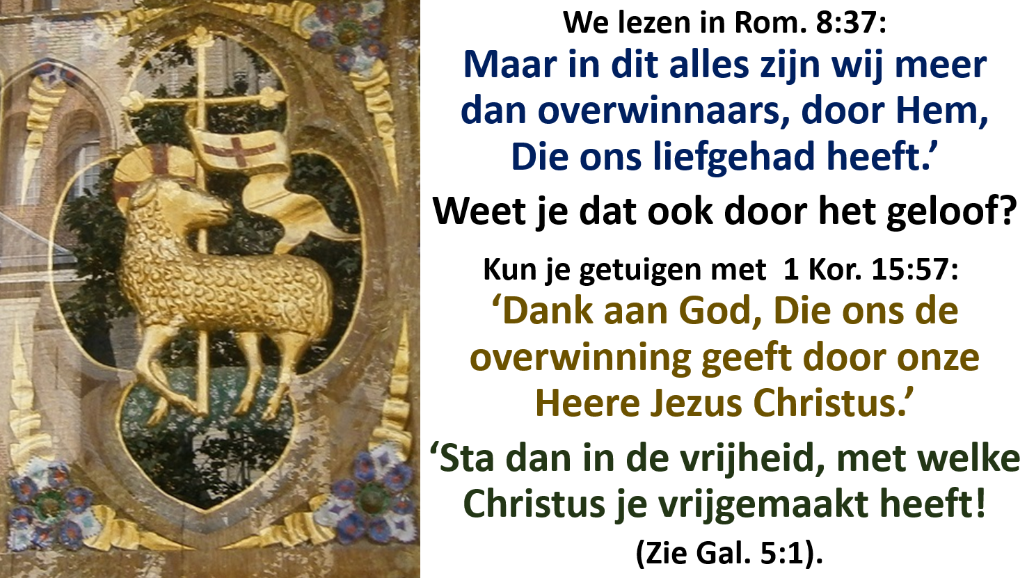 We lezen over de (uiteindelijke) overwinning in Openb. 17:14: ‘Dezen zullen oorlog voeren tegen het Lam, en het Lam zal hen overwinnen (want Het is een Heere der heren, en een Koning der koningen), en die met Hem zijn, de geroepenen, de uitverkorenen en gelovigen’ (Openbaring 17:14)