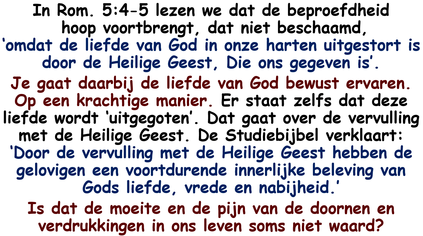 In Rom. 5:4-5 lezen we dat het ook hoop voortbrengt, dat niet beschaamd, ‘omdat de liefde van God in onze harten uitgestort is door de Heilige Geest, Die ons gegeven is’.